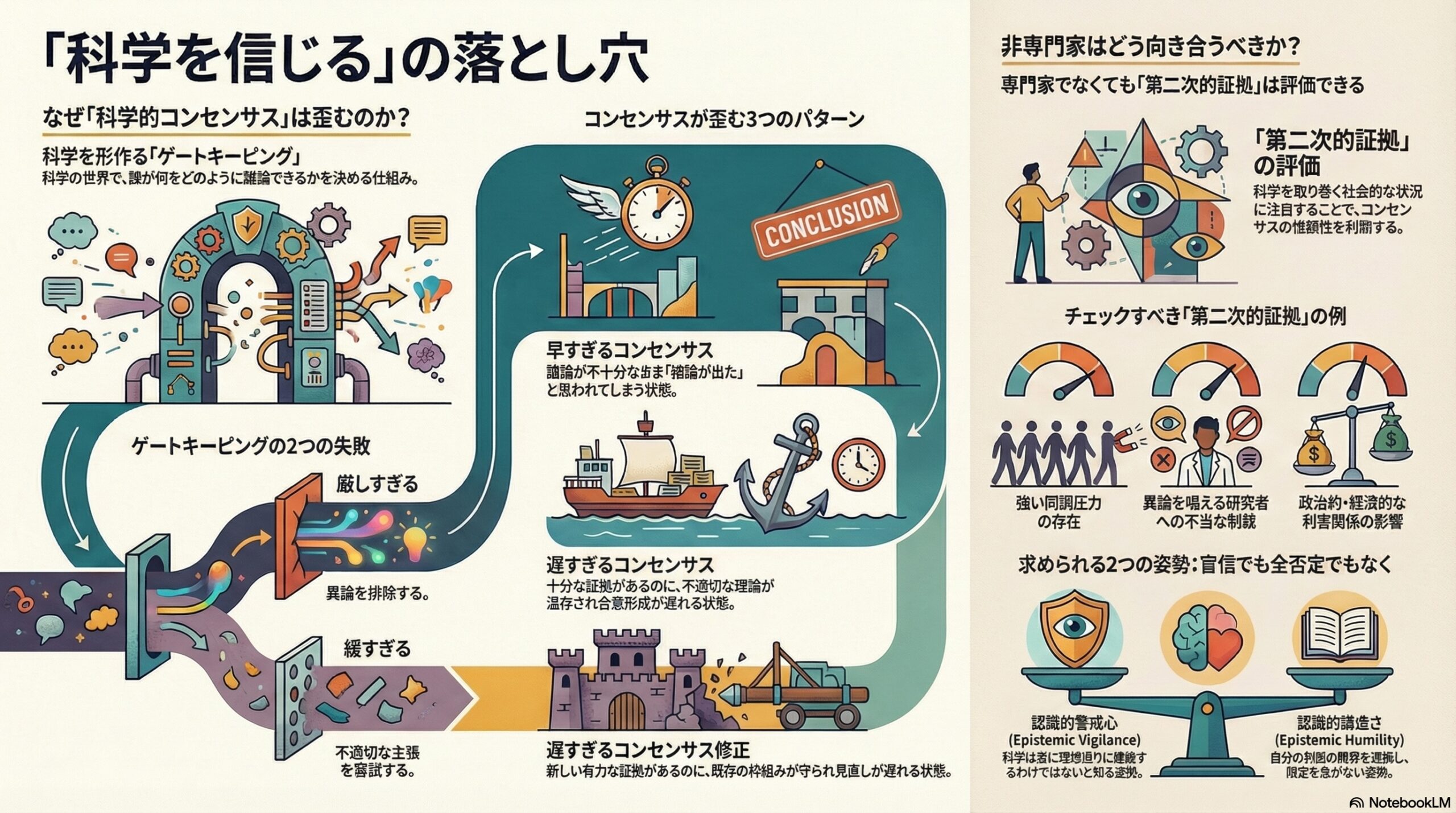 • ゲートキーピングの失敗が、早すぎる・遅すぎるコンセンサスやその修正の遅速につながり、科学の信頼性を損なうと説明されています。
