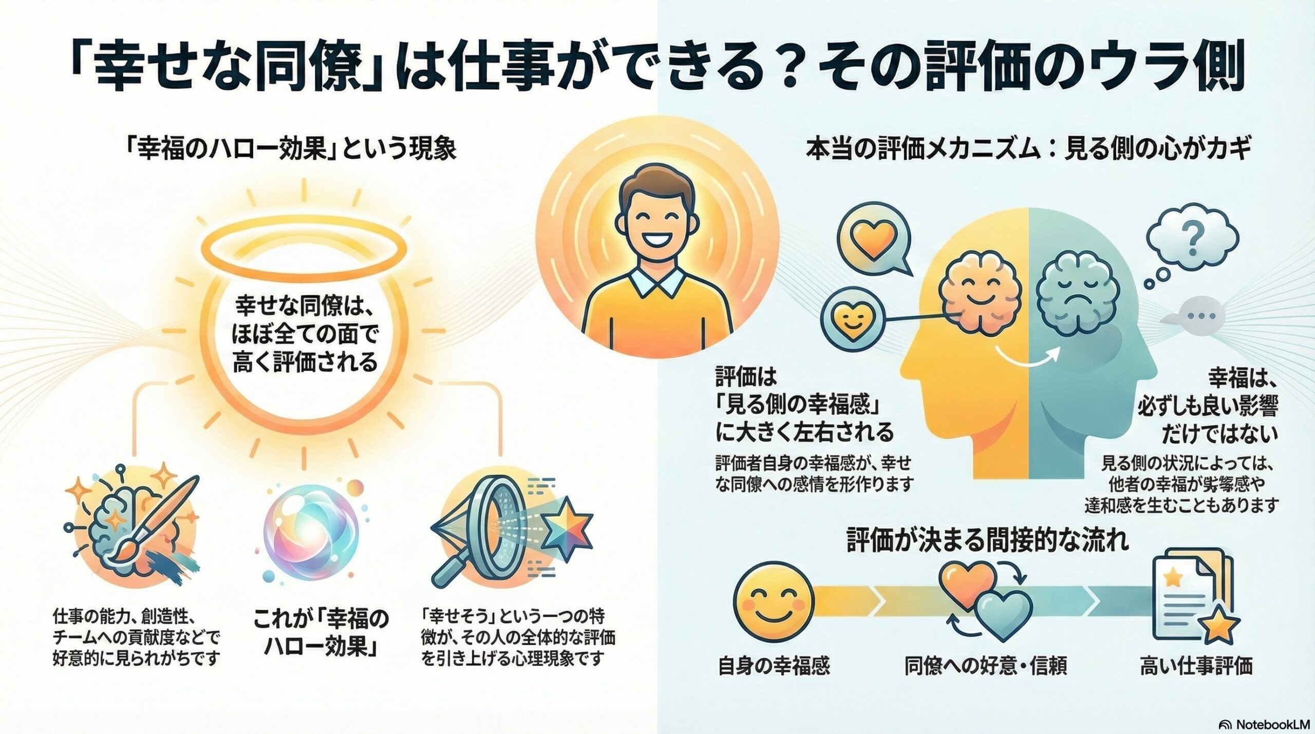 - 幸せそうな同僚は、同僚からも高く評価されやすい「幸福のハロー効果」がある。