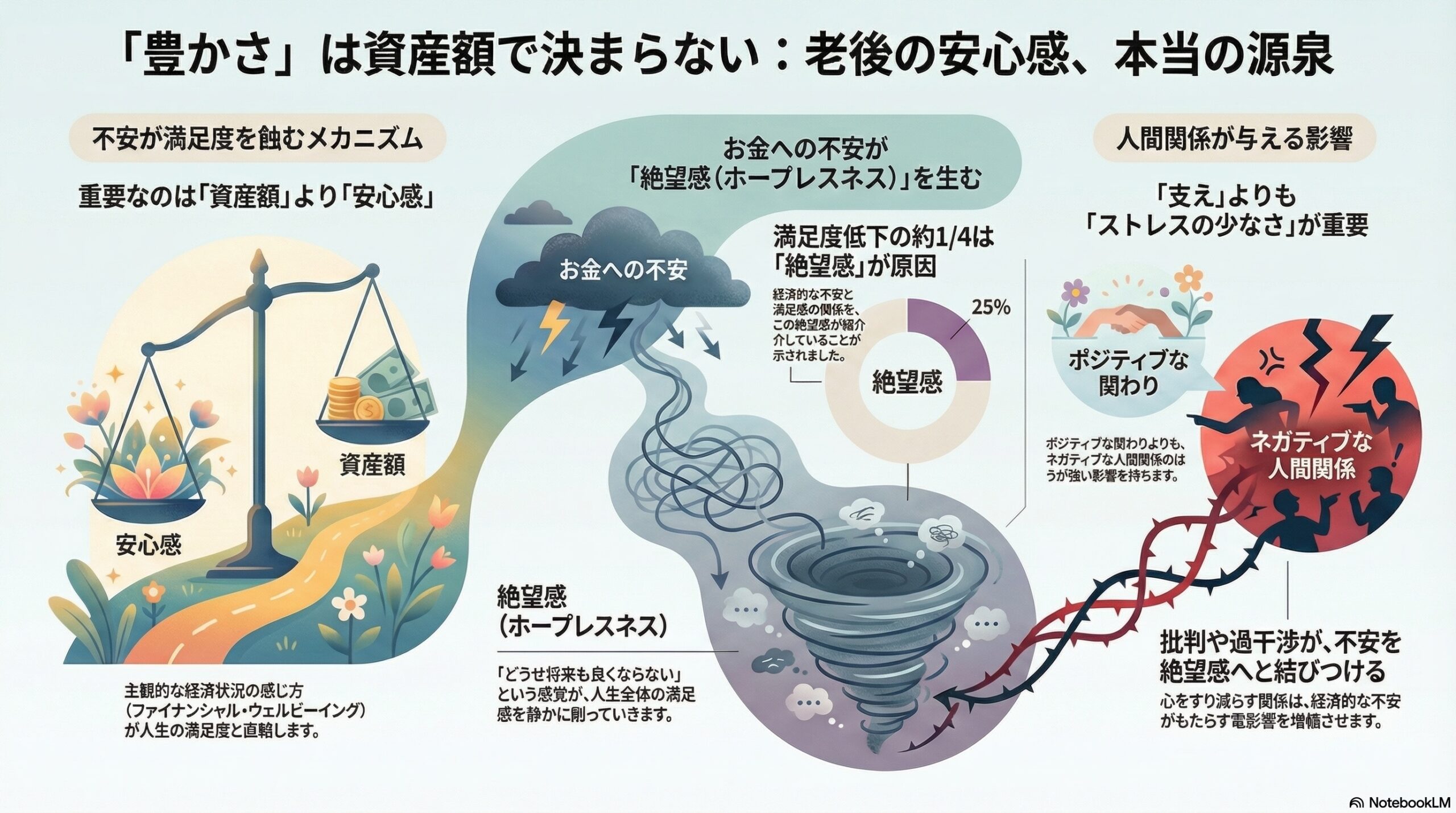 - ネガティブな人間関係が経済的不安をホープレスネスへつなぎ、満足度を下げやすい。