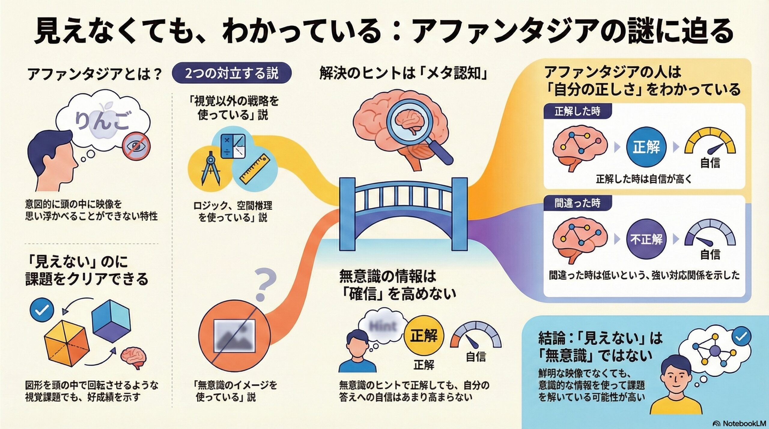 もう一つは、「視覚イメージは使われているが、それは無意識だ」という考え方です。本人は見えていないと感じているものの、実際には無意識の視覚イメージが課題処理を支えている、という解釈です。