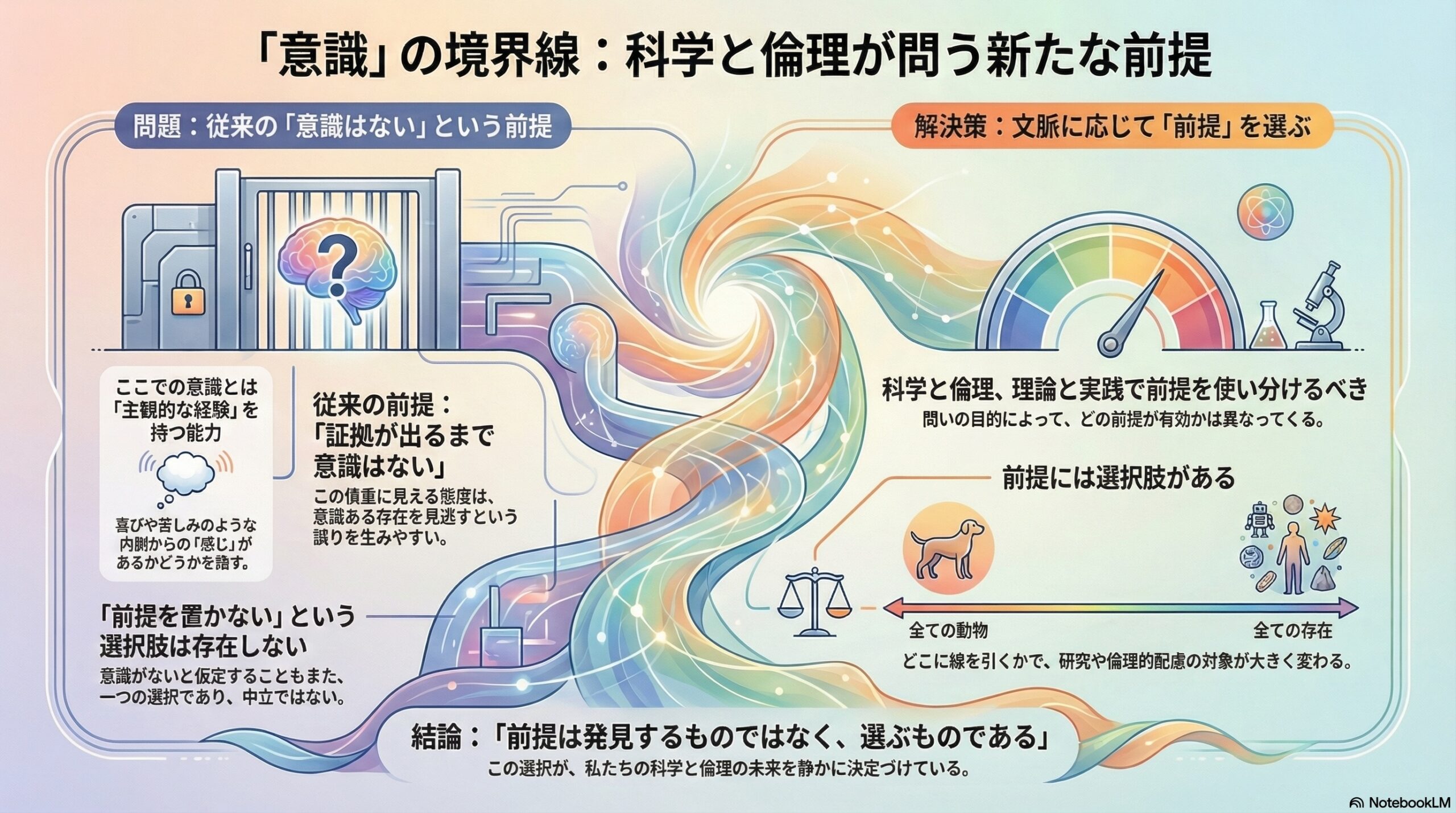 「証拠が出るまでは意識なし」とするのも、ひとつの前提です。そしてその前提は、特定の種類の誤り――意識がある存在を見逃す誤り――を体系的に生みやすいのです。