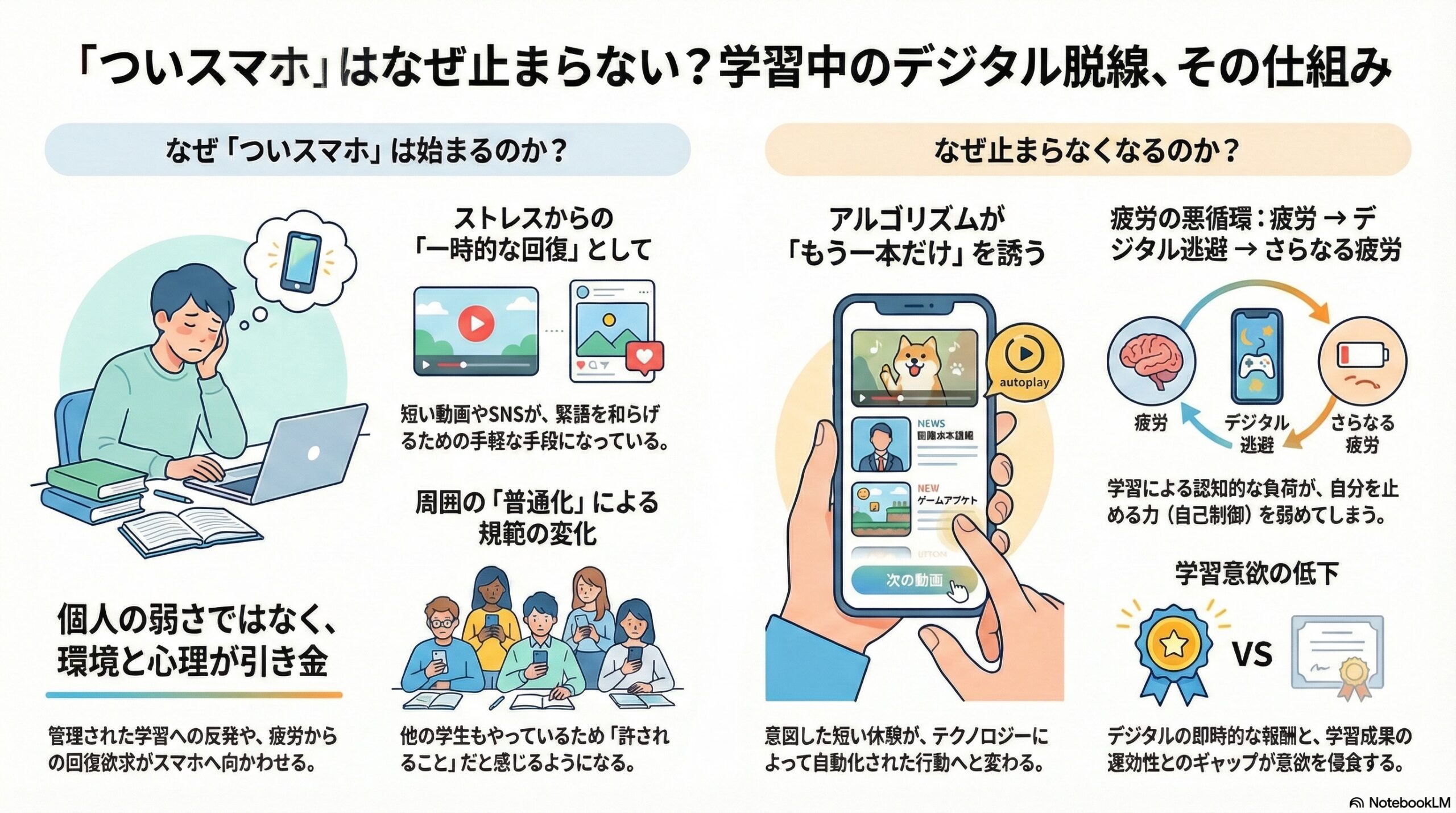- デバイスは学習道具である一方、誘惑を続けさせる仕組みや疲労で維持されやすい。