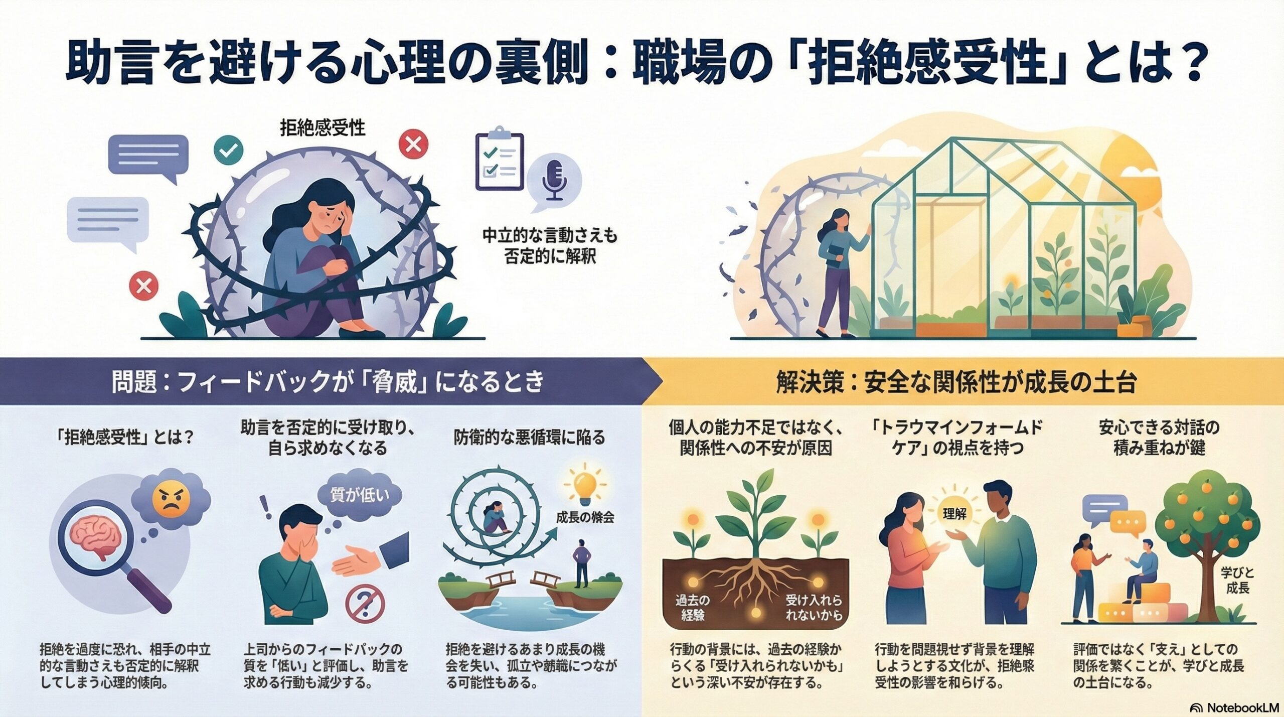- 拒絶感受性が高い人は、上司のフィードバックを低く感じたり、助言を自分から求めにくくなることがある。