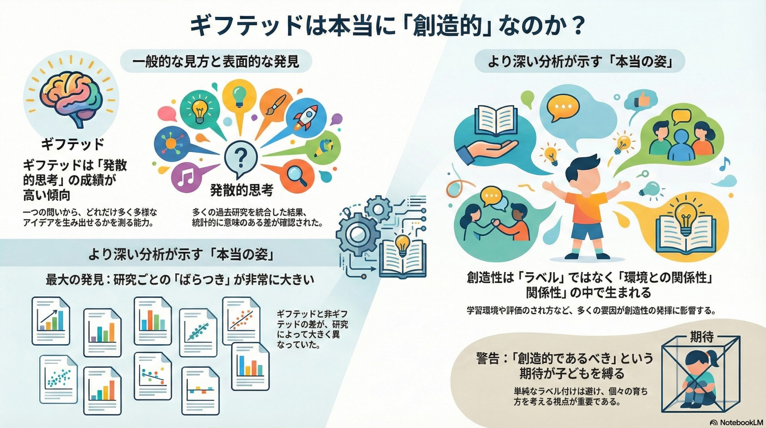 - しかし研究ごとに差の大きさにはばらつきがあり、ギフテッドだからといって必ず創造的とは限らない。