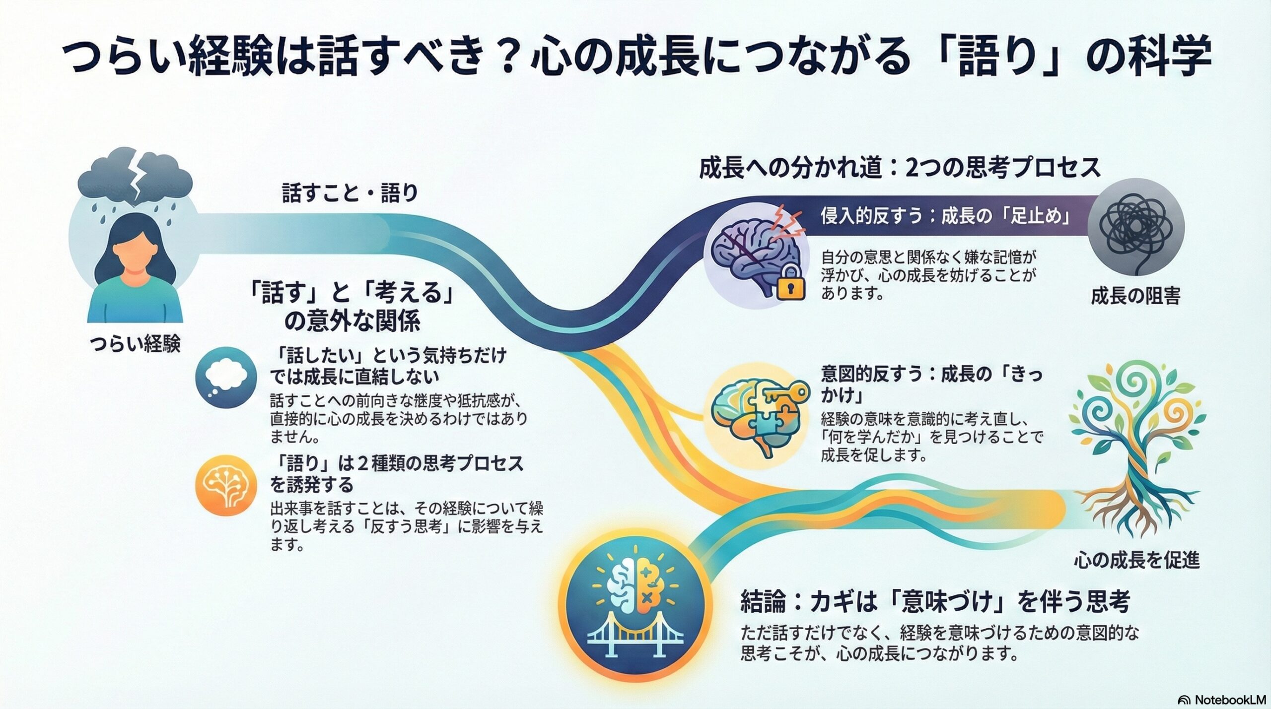 重要なのは、この成長が「つらい出来事そのもの」から自然に生まれるわけではないという点です。研究では、その出来事をどう受け止め、どう考え続けたかという心のプロセスが、成長に大きく関わると考えられています。