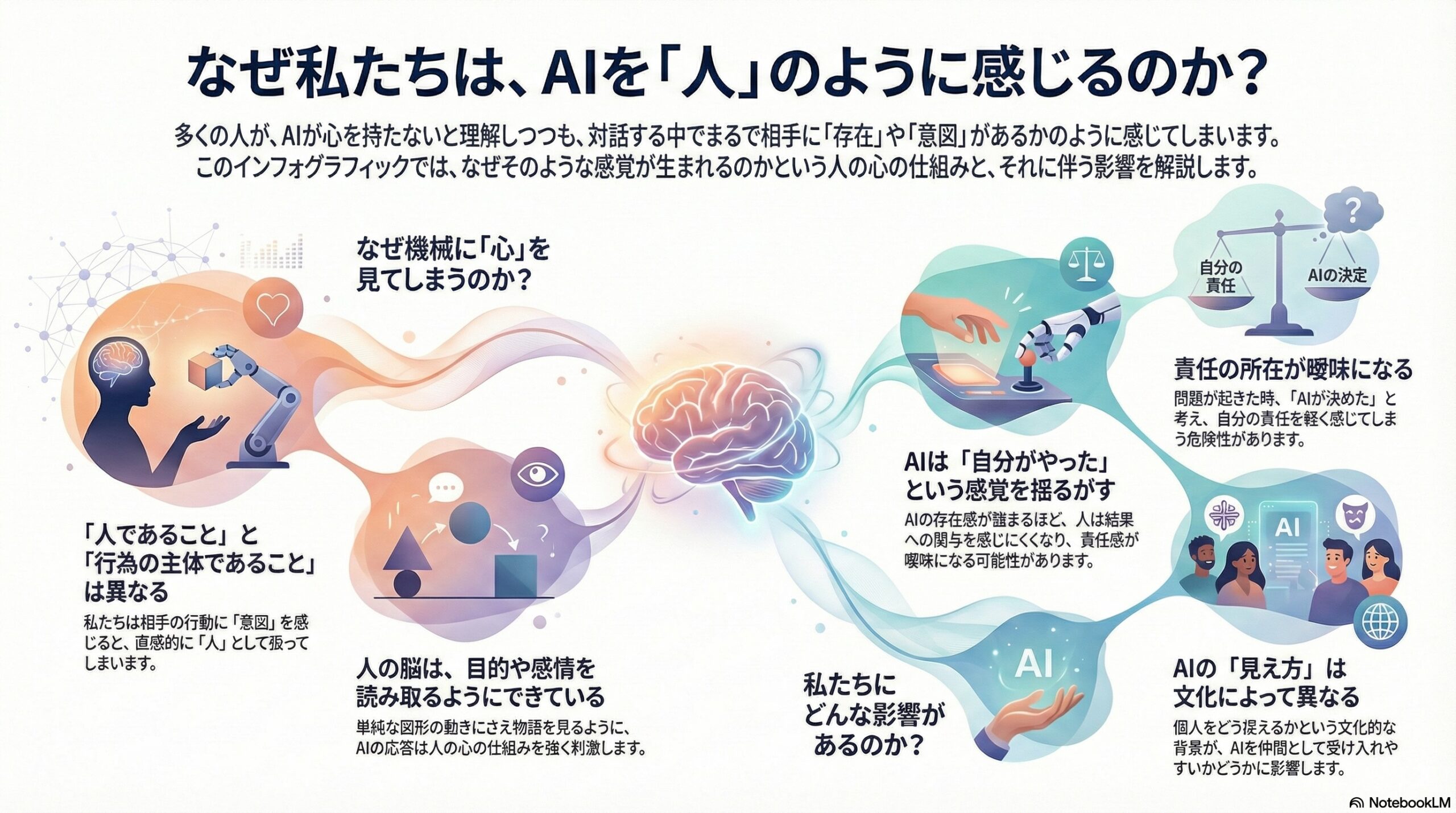 中国の東南大学と深圳大学によるこの研究は、AIが本当に人なのか、心をもつのかという結論を出そうとするものではありません。そうではなく、「人はなぜAIに人らしさや行為の主体を感じてしまうのか」「そのとき、人自身の感覚や責任意識はどのように変わるのか」という、人の側の体験に焦点を当てています。