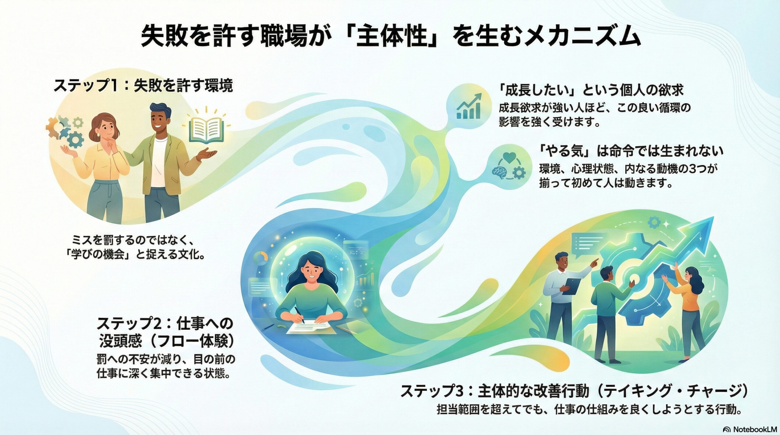 「失敗してもいい」と言葉で伝えるだけでは足りません。実際に、失敗したときにどう扱われるか、そこに学びがあると感じられるかが重要です。その積み重ねが、仕事への没頭感を生み、結果として行動を変えていきます。