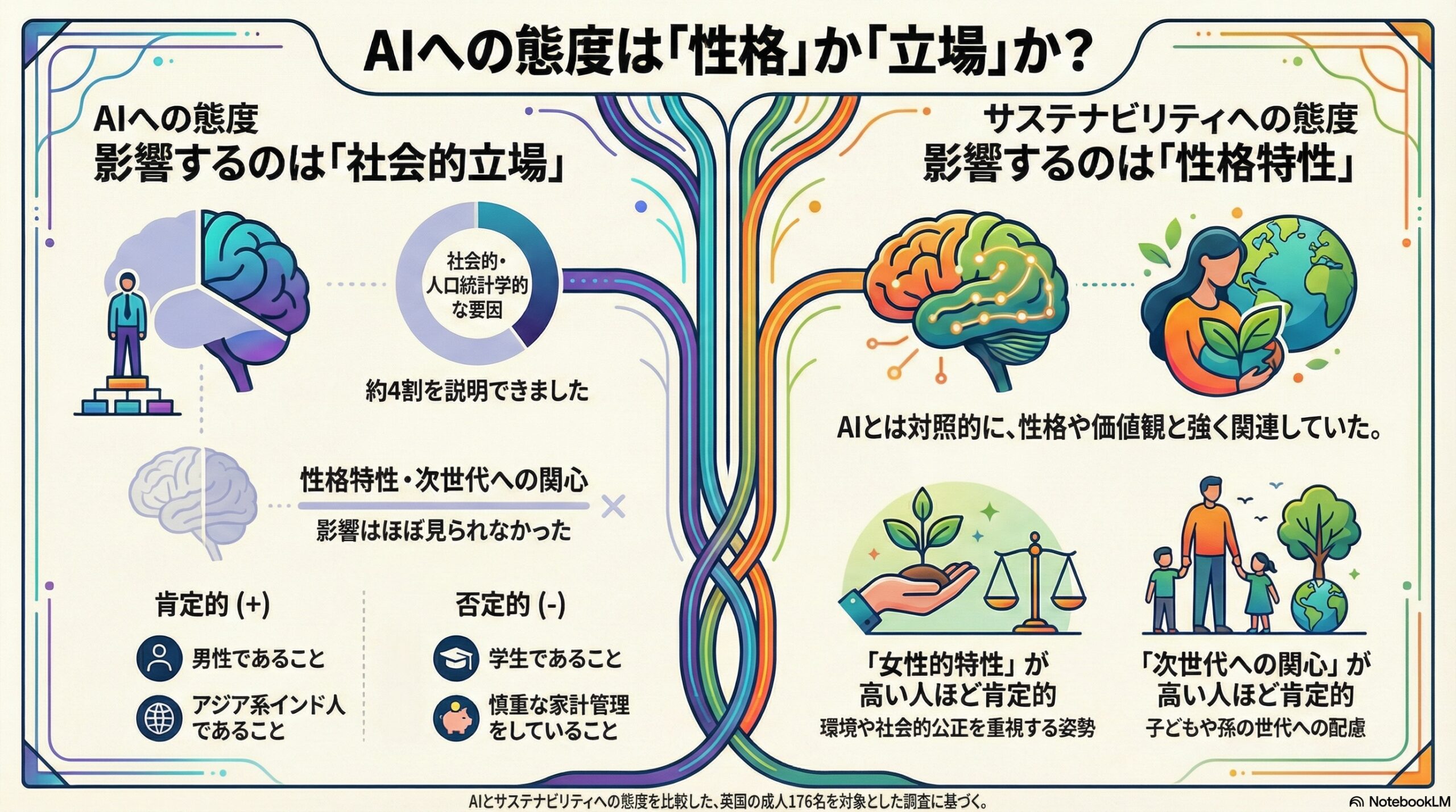 - AIへの態度を決めるのは、性格よりも性別や学生かどうか、日常の家計管理といった社会的立場の方が強く影響していた。