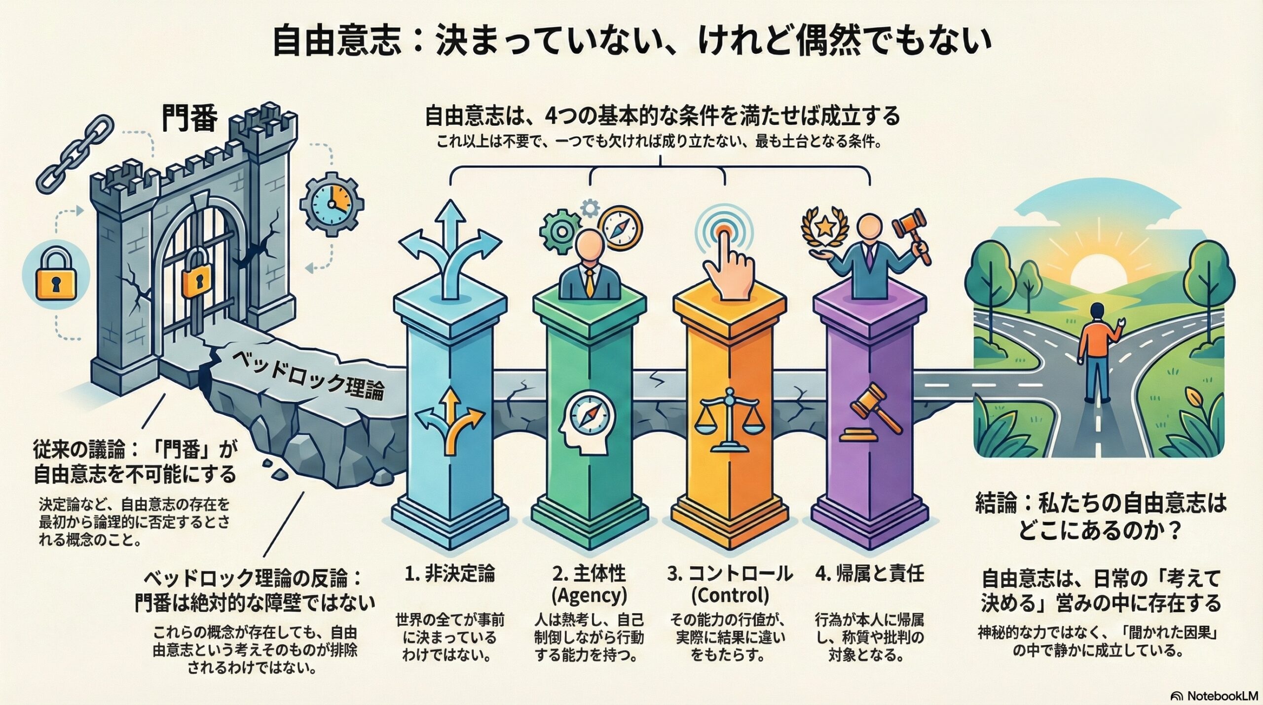 - 自由意志は「これ以上削れない最低限の条件」から説明するベッドロック理論という考え方で整理されている。