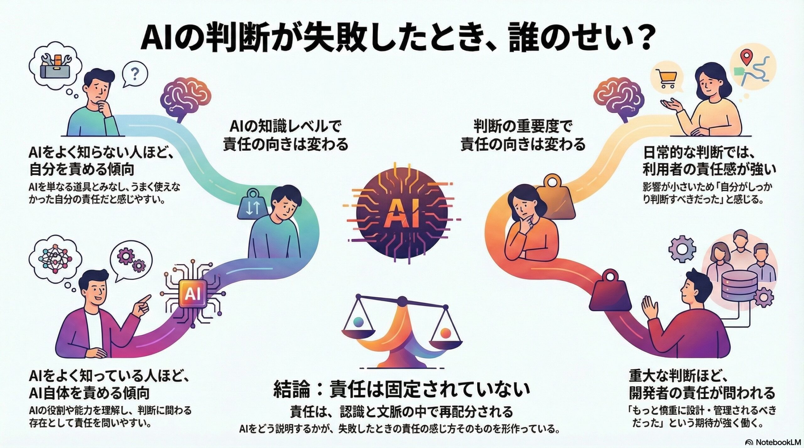 • 事前にAIの説明を見た人は「AIに責任がある」と感じやすく、知らない人は「自分に責任がある」と感じやすい。