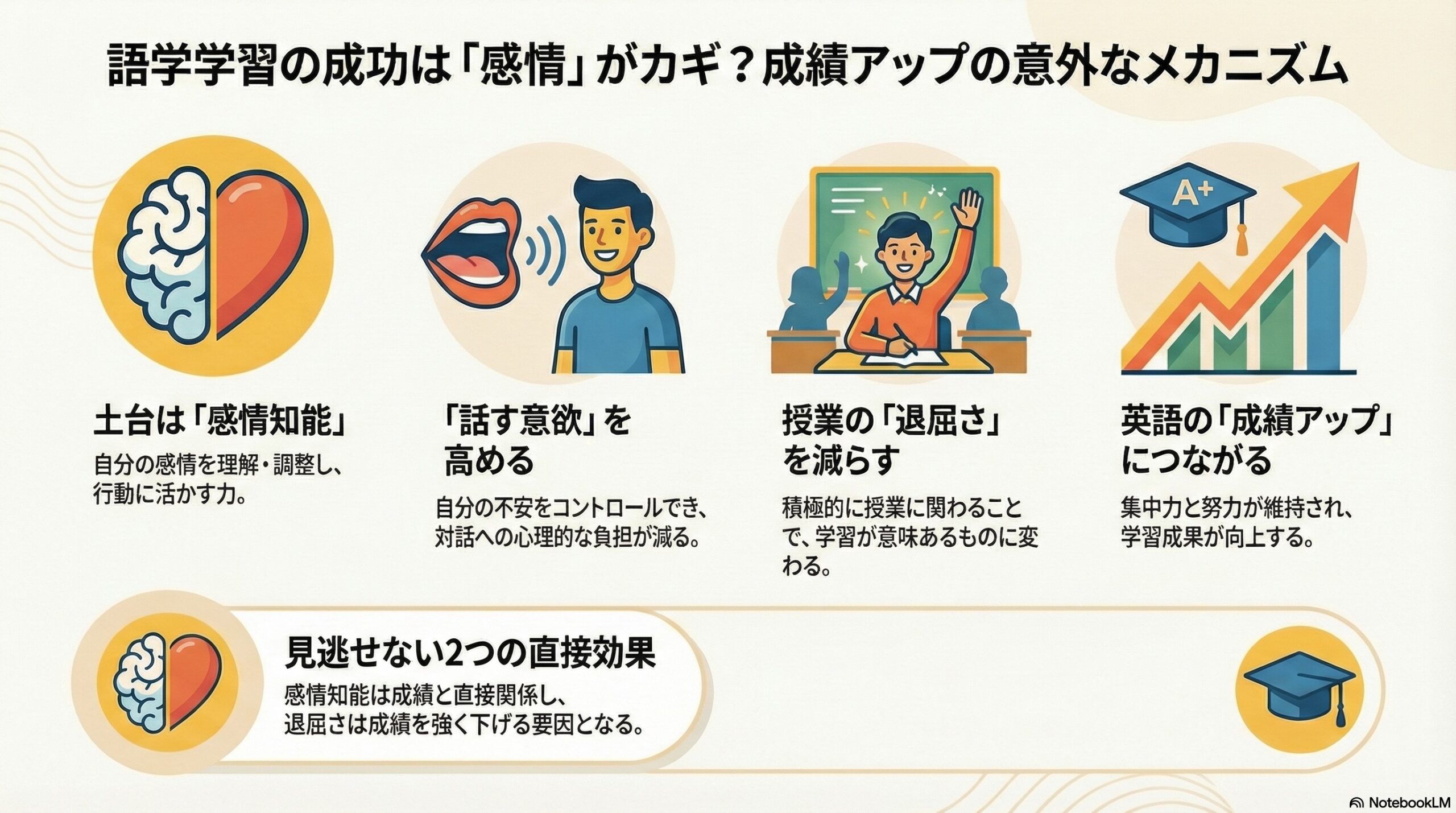 感情知能がすべてを直接変えるのではなく、「関わろうとする姿勢」を通して学習体験そのものを変えていく点が、この研究の特徴です。