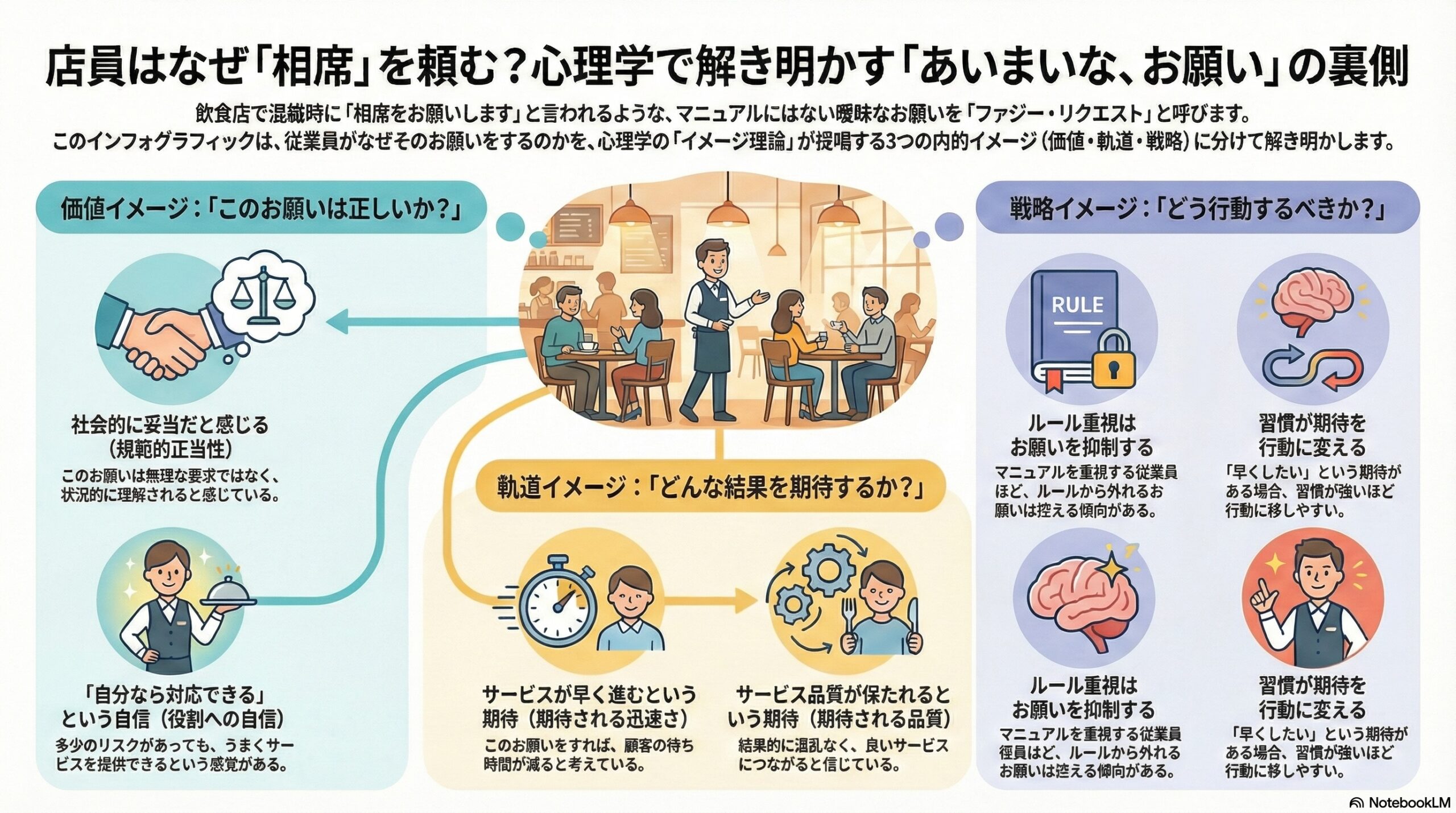 レストランで混雑しているときに「相席をお願いできますか」と声をかけられた経験は、多くの人にあると思います。このお願いは、サービスの決まりに明確に書かれているわけではありません。しかし、非常識とも言い切れず、現場では自然に行われています。本論文が扱うのは、このようなサービス現場でフロントライン従業員が行う、ルールからわずかに外れたお願いです。研究ではこれを「ファジー・リクエスト」と呼んでいます。