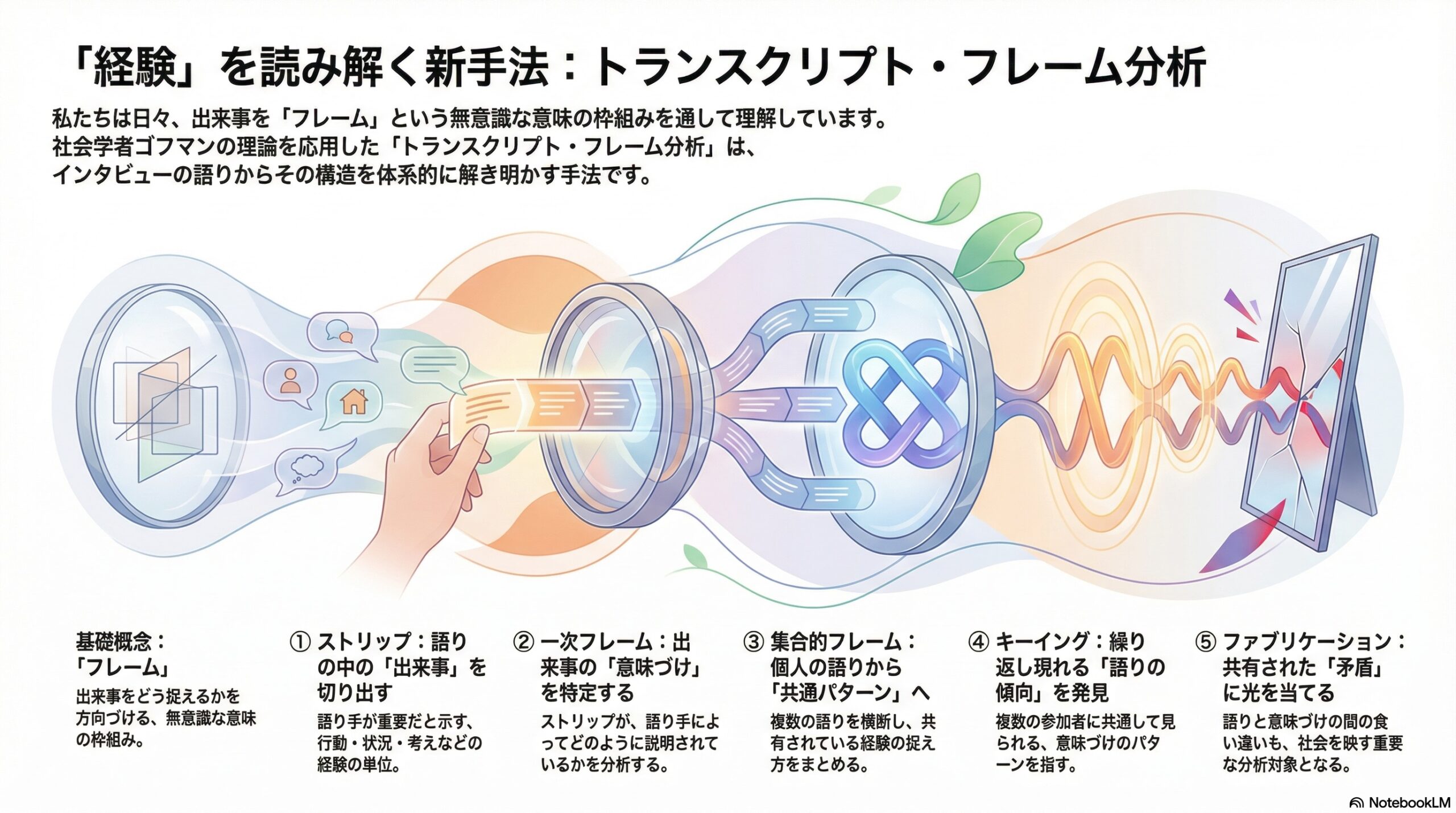 ポッチュラートが提案する「トランスクリプト・フレーム分析」は、ゴフマンの理論をそのまま適用するのではなく、実際の質的研究で使える形へと再構成した分析手法です。この方法の目的は、インタビューを単なる発言の集合として扱うのではなく、経験がどのような意味構造をもって語られているのかを明らかにすることにあります。