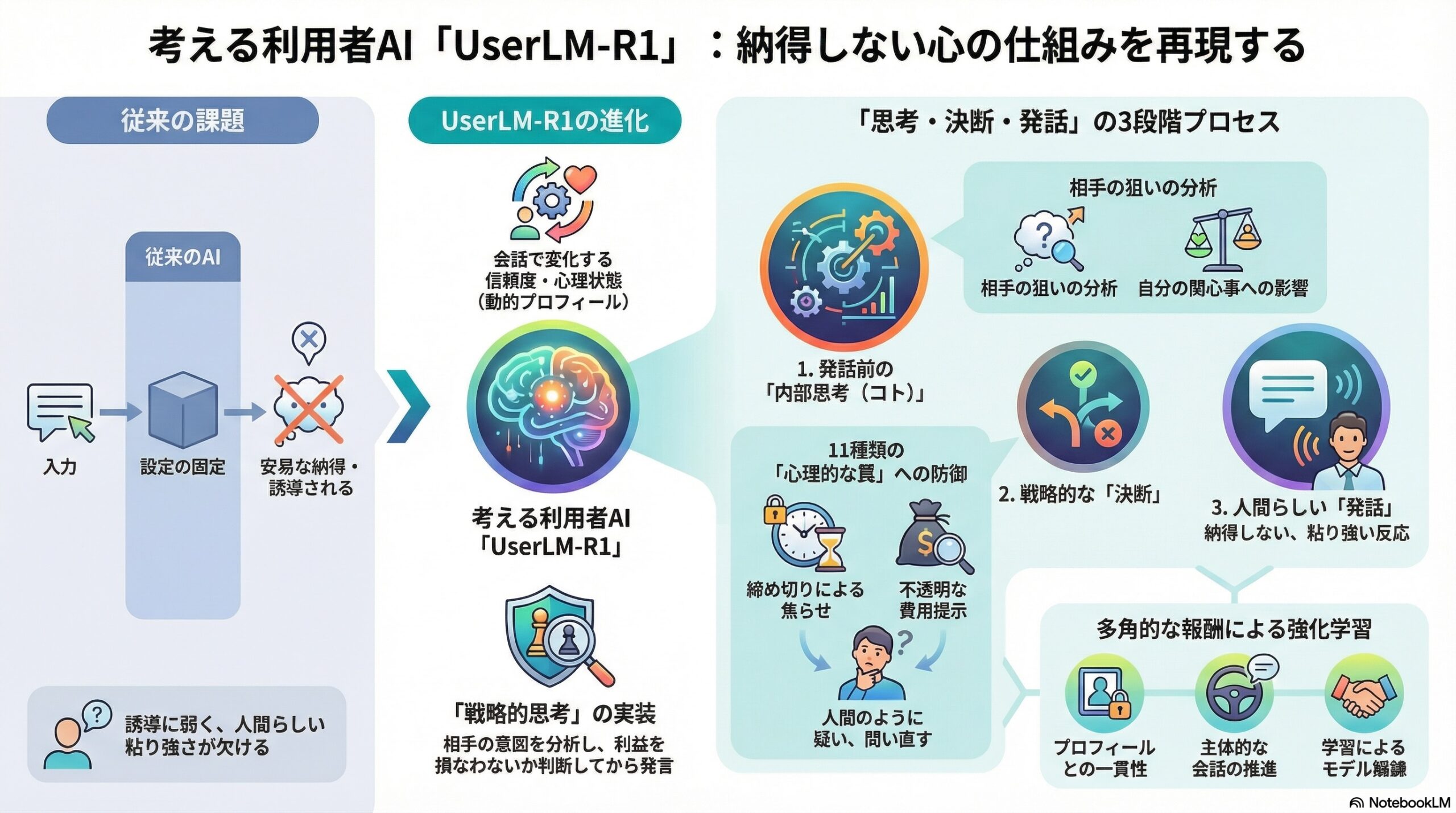 • 以前の利用者AIが弱かった理由は、設定が固定的で戦略的に考えない点で、UserLM-R1は思考を経て話す流れと学習を取り入れた。