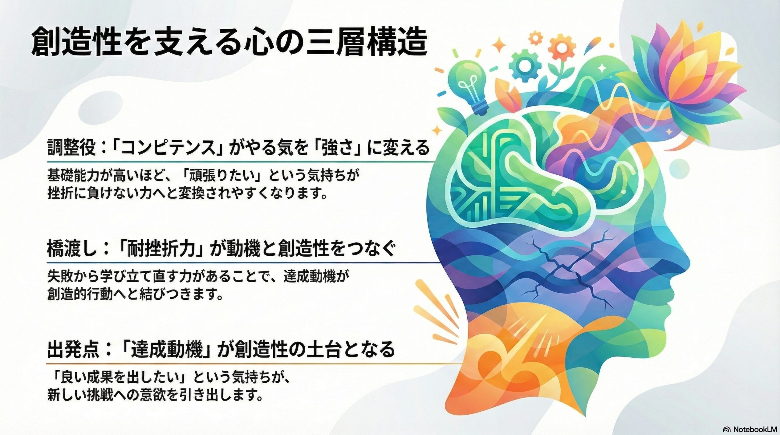 • 達成動機だけでは十分でなく、耐挫折力を通して創造性傾向が高まることが、研究で示された。