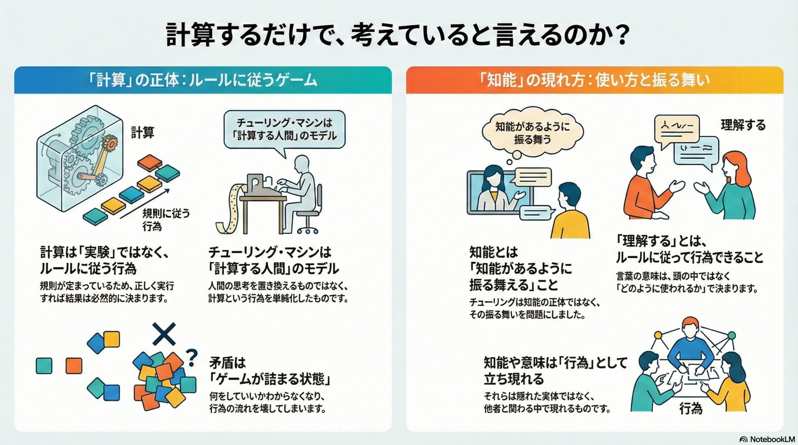 - チューリングの機械は「計算する人間」を単純化したモデルで、知能はどう動くかの振る舞いで判断されるべきで、意味・知能は使われ方の中に現れると結論づけられる。