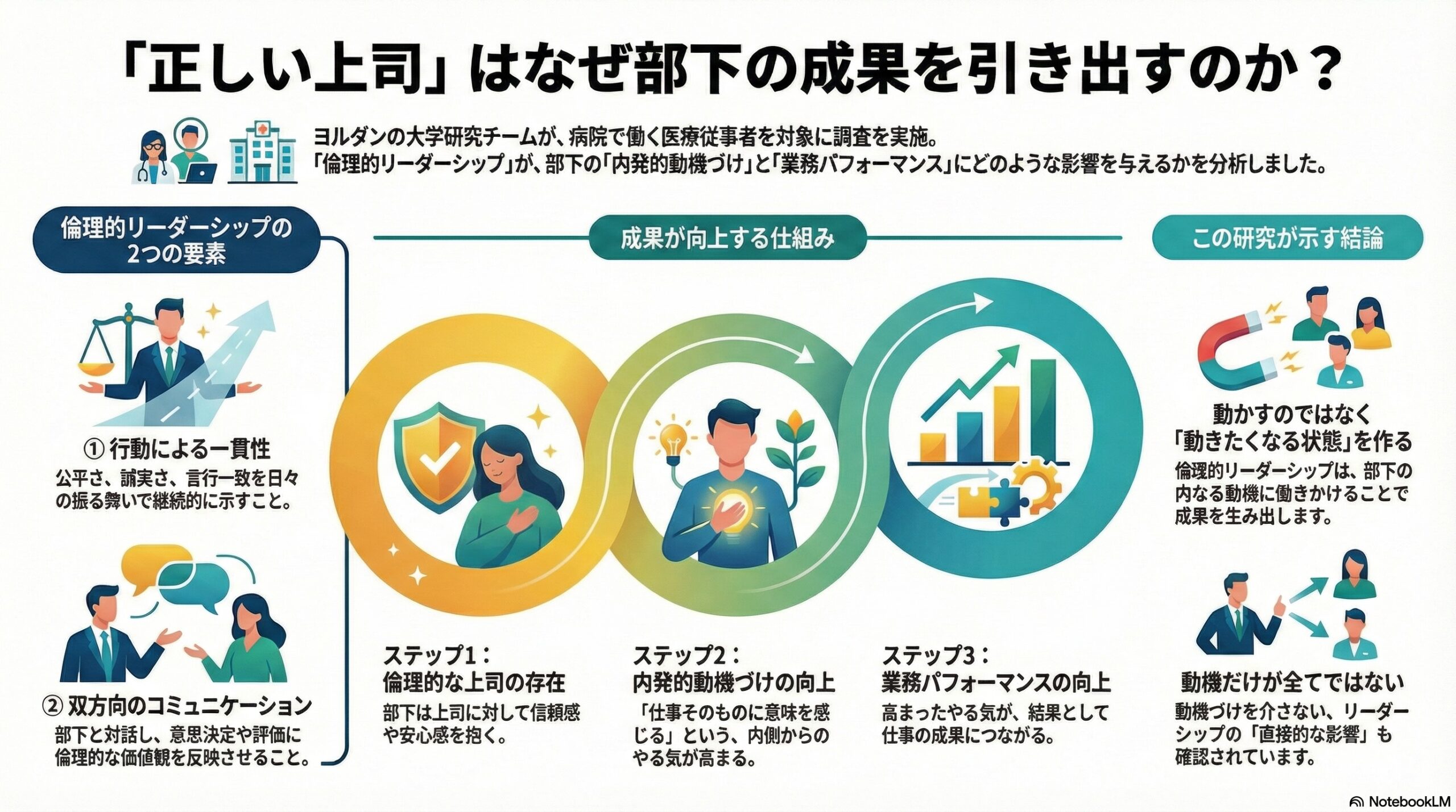 この研究は、「正しい上司であること」が、単なる道徳的理想にとどまらず、実際の職場パフォーマンスと結びついていることを示しています。ただし、その効果は命令や管理によって生まれるのではなく、働く人の内側にある動機の変化を通じて現れていました。
